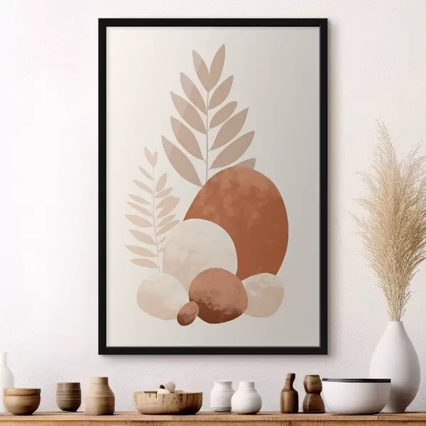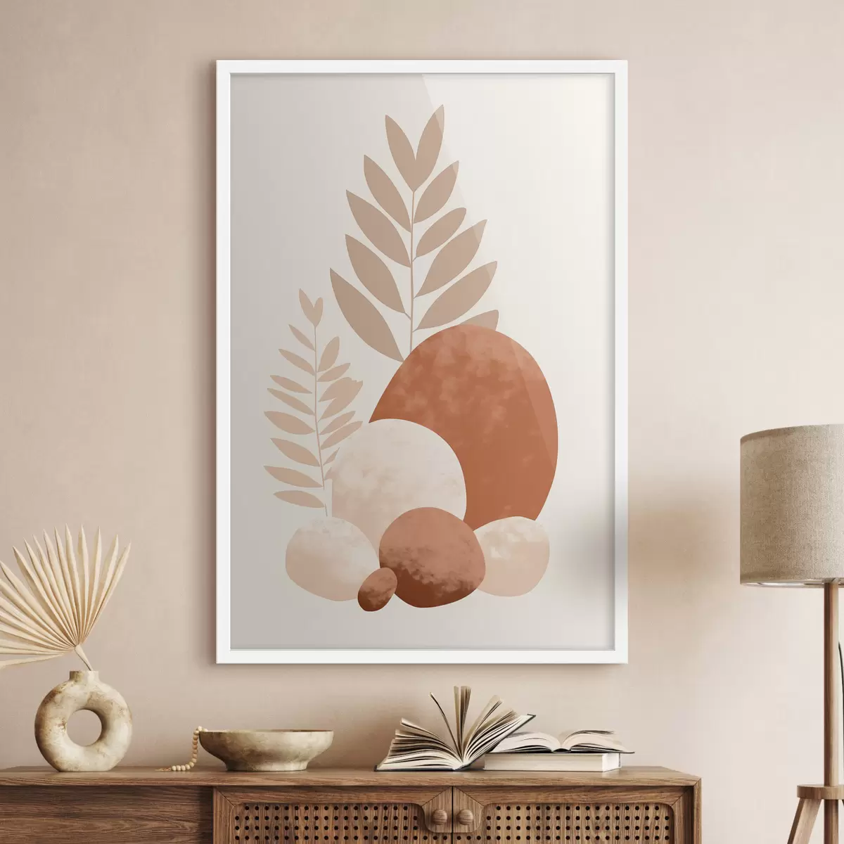 Poster Abstrakte Formen, strukturierte Steine und Blätter in gedeckten Pfirsich- und Terrakottatönen, minimalistisch, cremefarbener Hintergrund Nr f47013