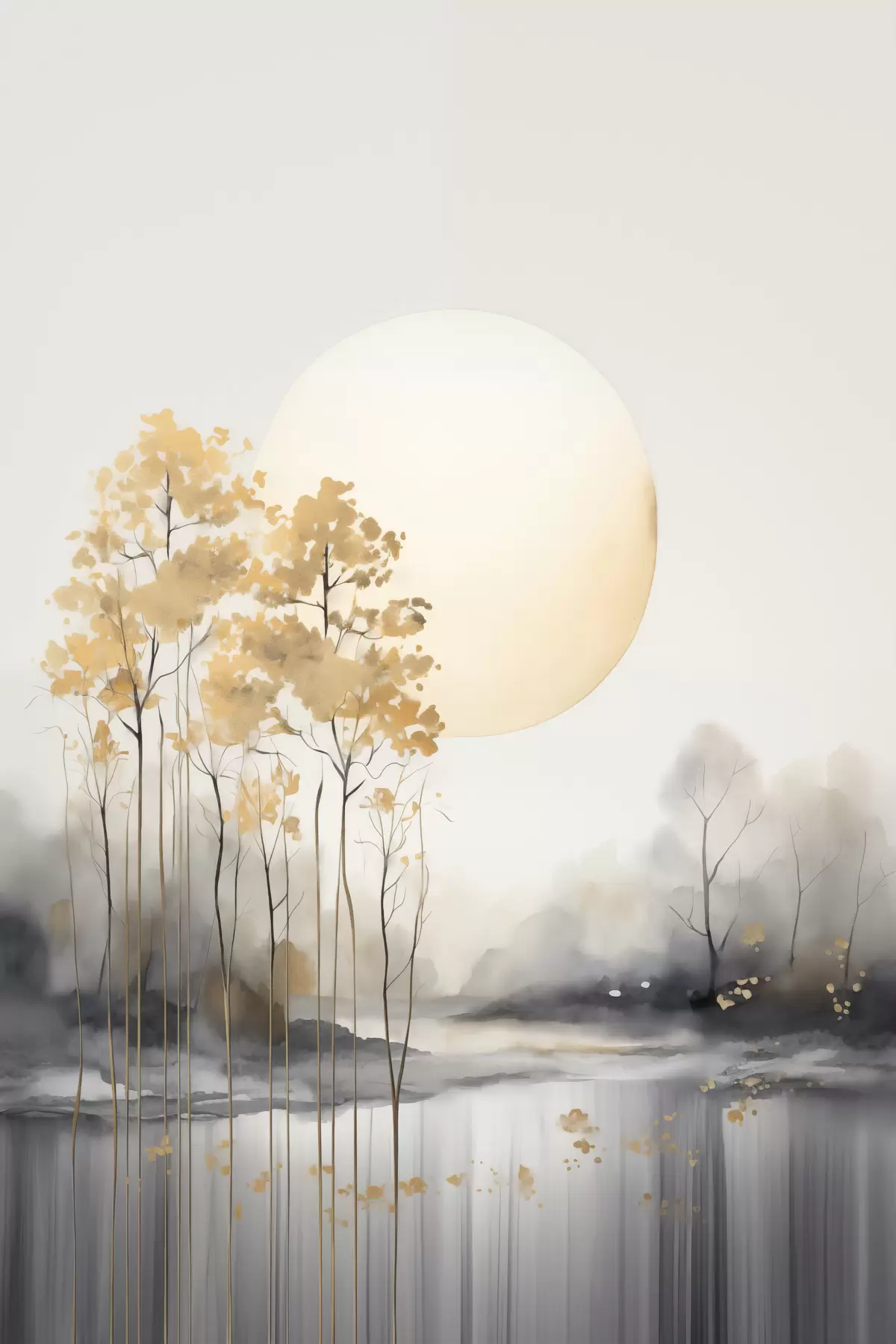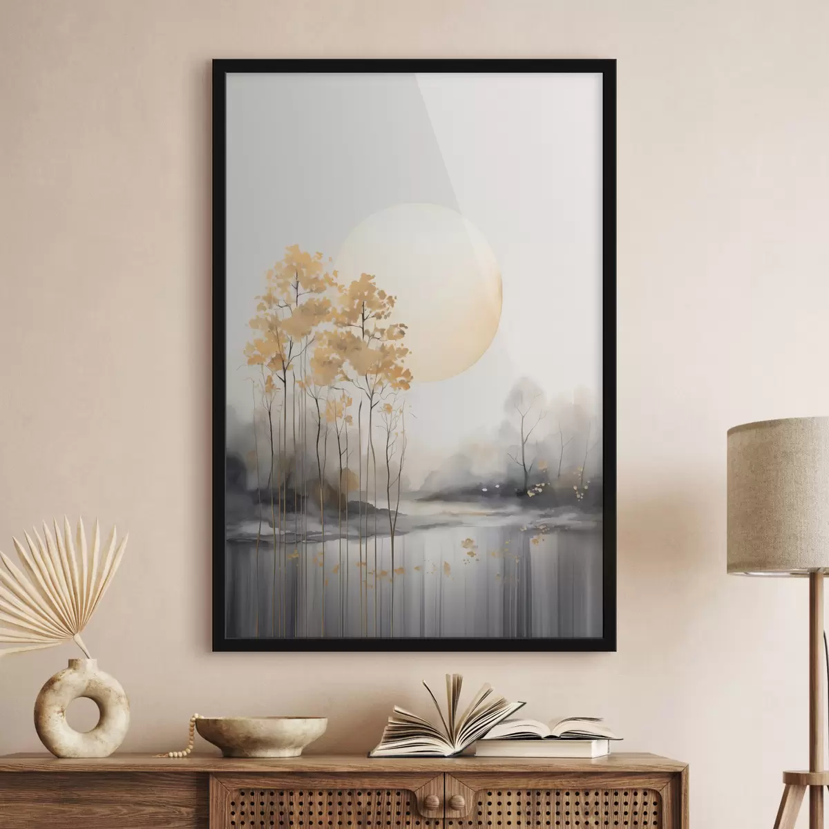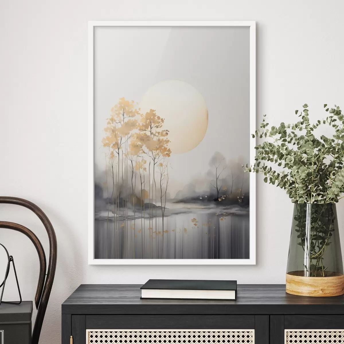 Poster Dekorative abstrakte Landschaft, hohe Bäume mit gelben Blättern, ein Fluss und Nebel im Hintergrund Nr f47014