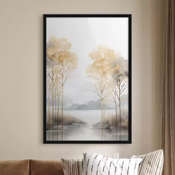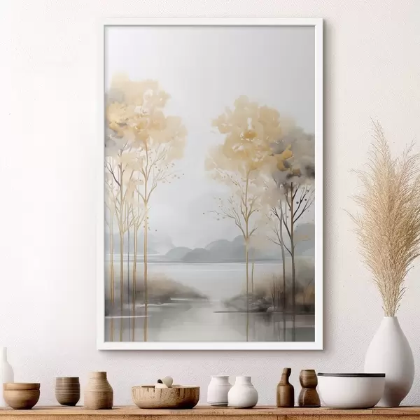 Poster Dekorative abstrakte Landschaft, hohe Bäume mit gelben Blättern, ein Fluss und Nebel im Hintergrund Nr f47015
