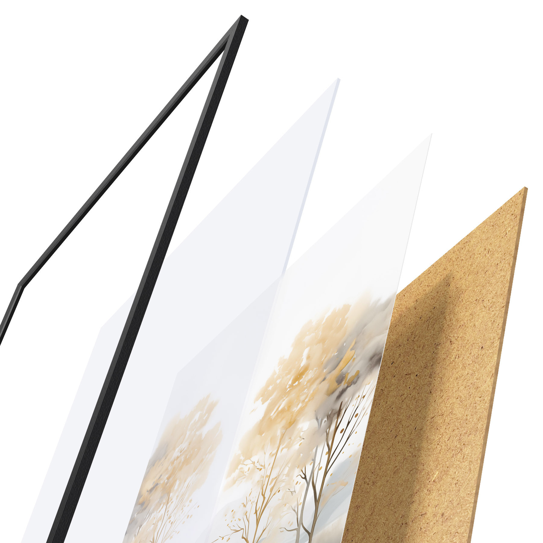 Das Poster besteht aus einem Rahmen, Plexiglas, einem gedruckten Bild und einer Rückwand aus Spanplatten. Dank der Halterungen auf der Rückseite kann das Poster sofort an die Wand gehängt werden.