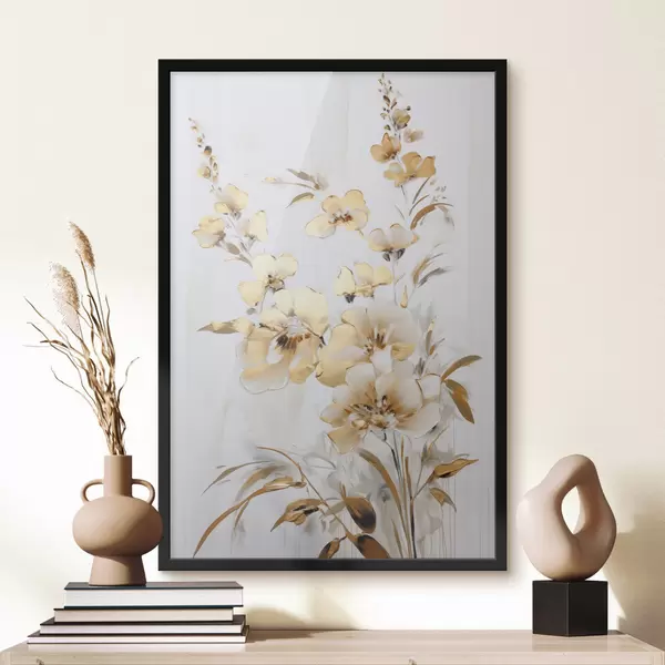 Poster Strukturierte gelbe Blüten und Blätter vor weißem Hintergrund, mit zarten Pinselstrichen Nr f47016