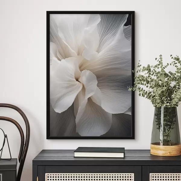 Poster Nahaufnahme von zarten, abstrakten weißen Blütenblättern mit filigranen Linien und einem verschwommenen dunklen Hintergrund Nr f47018