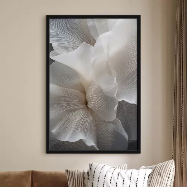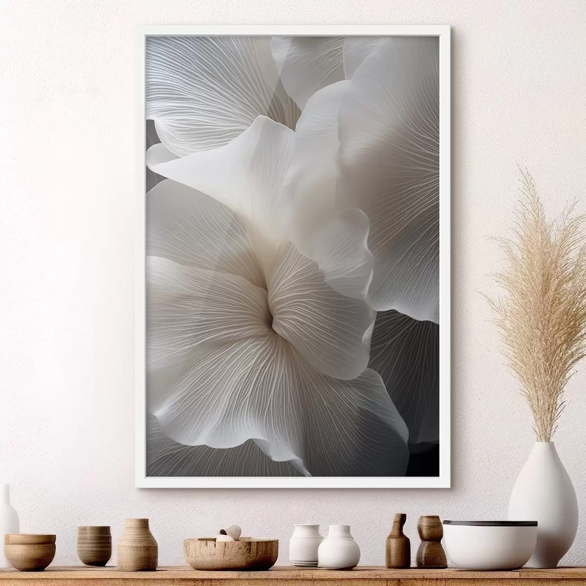 Poster Nahaufnahme von zarten, abstrakten weißen Blütenblättern mit filigranen Linien und einem verschwommenen dunklen Hintergrund f47019
