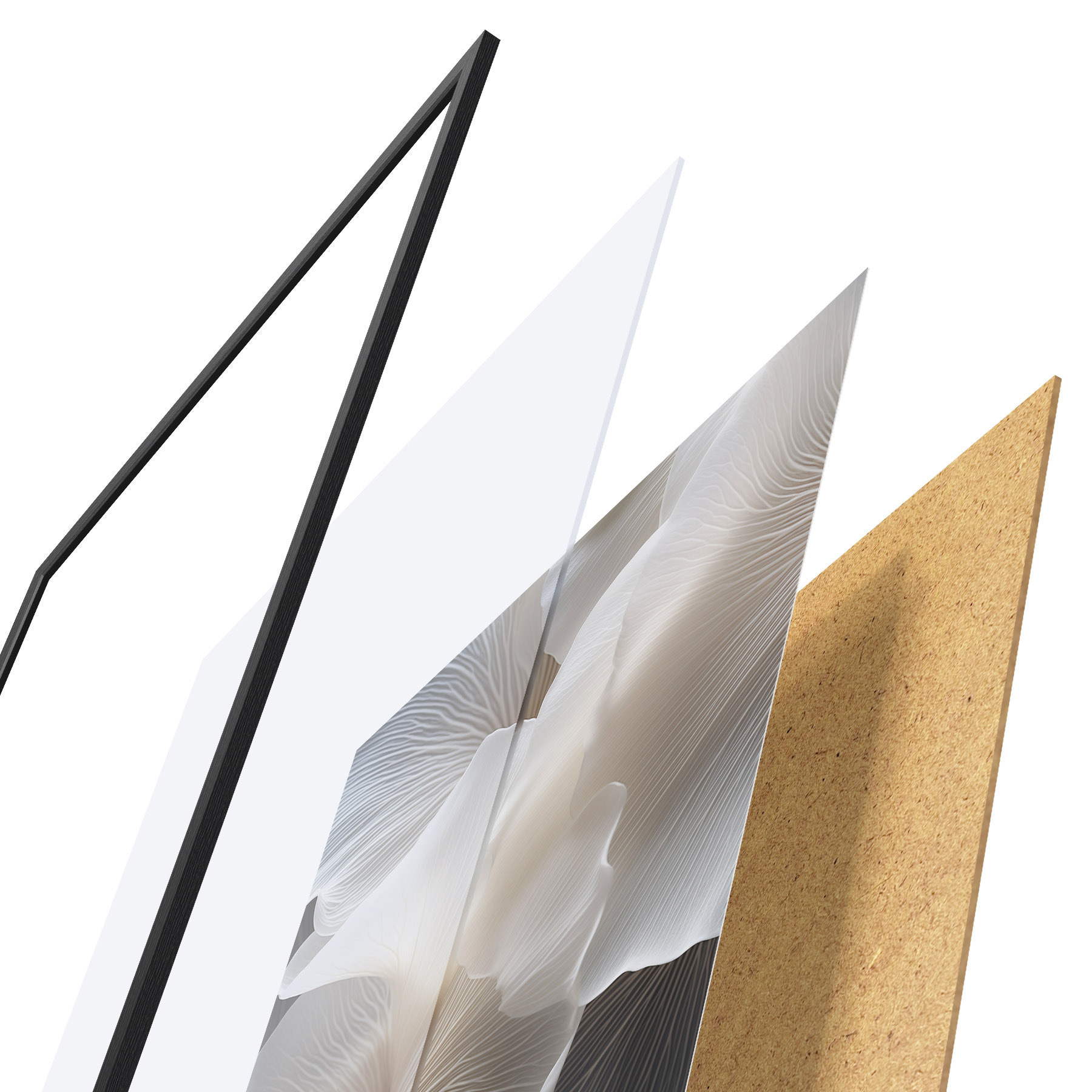 Das Poster besteht aus einem Rahmen, Plexiglas, einem gedruckten Bild und einer Rückwand aus Spanplatten. Dank der Halterungen auf der Rückseite kann das Poster sofort an die Wand gehängt werden.