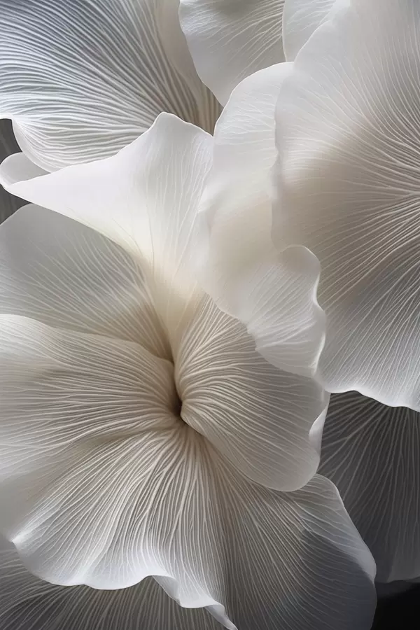 Poster Nahaufnahme von zarten, abstrakten weißen Blütenblättern mit filigranen Linien und einem verschwommenen dunklen Hintergrund Nr f47019