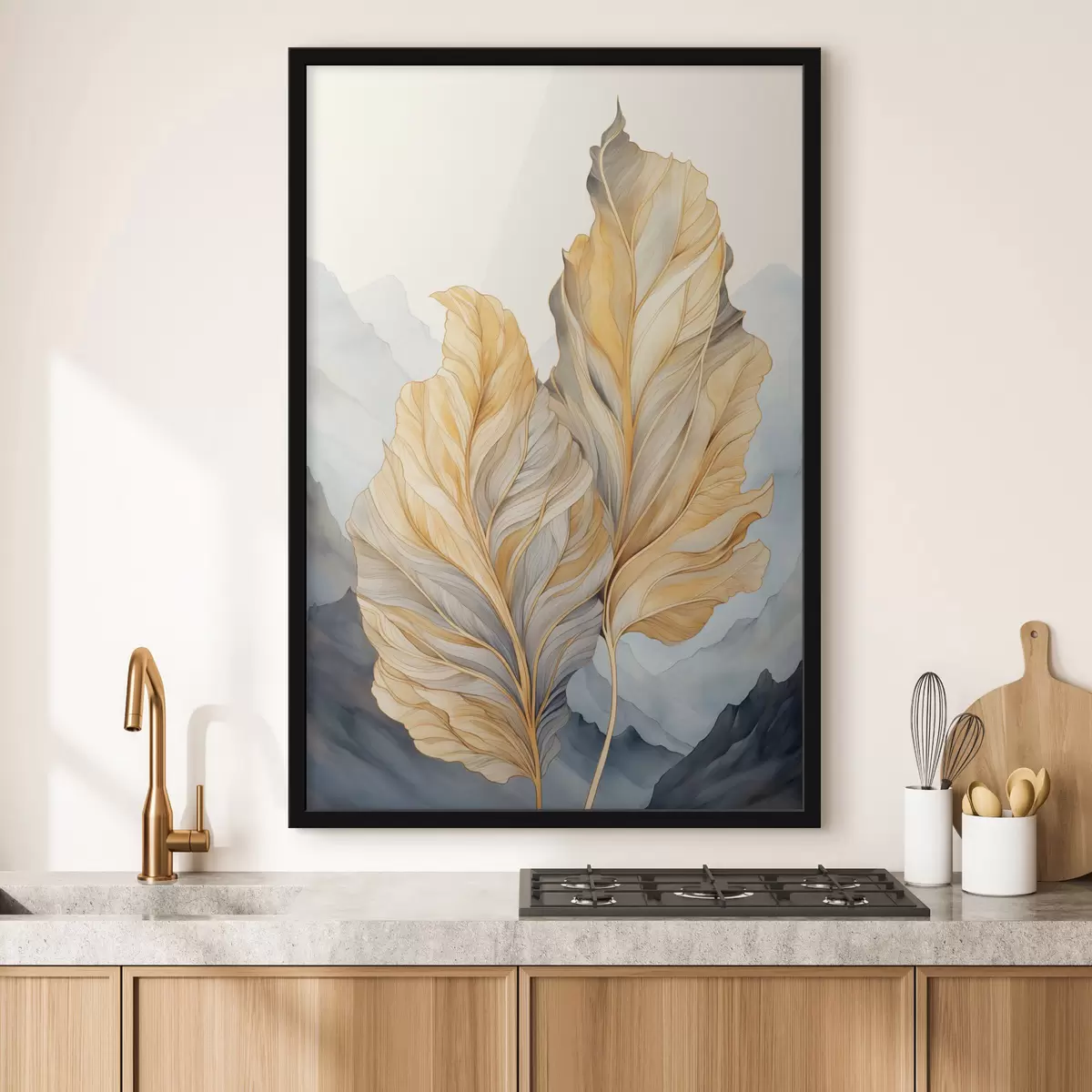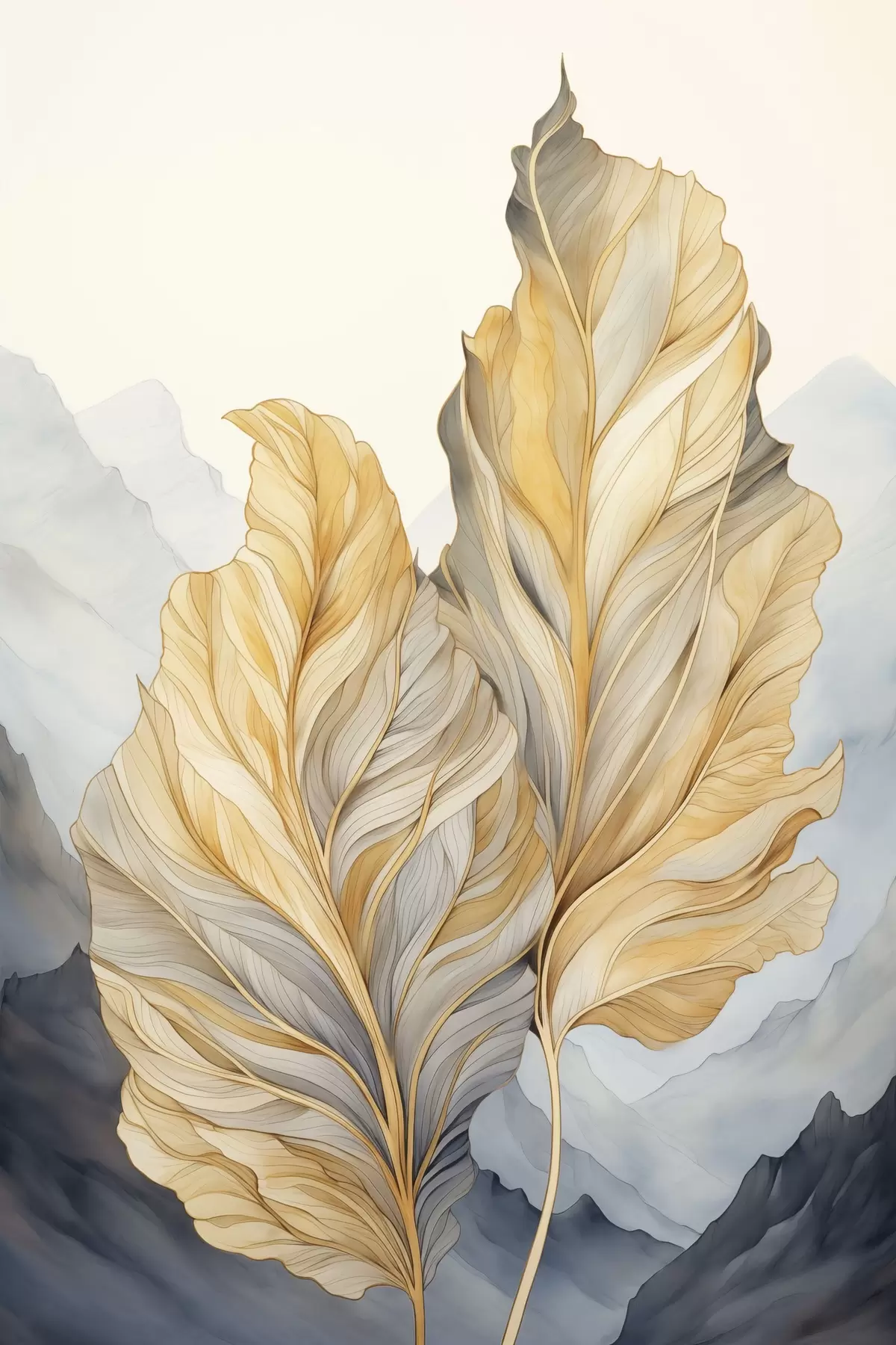 Poster Abstrakte große, gelbe und braune Blätter mit komplexen Details vor einer Berglandschaft Nr f47023