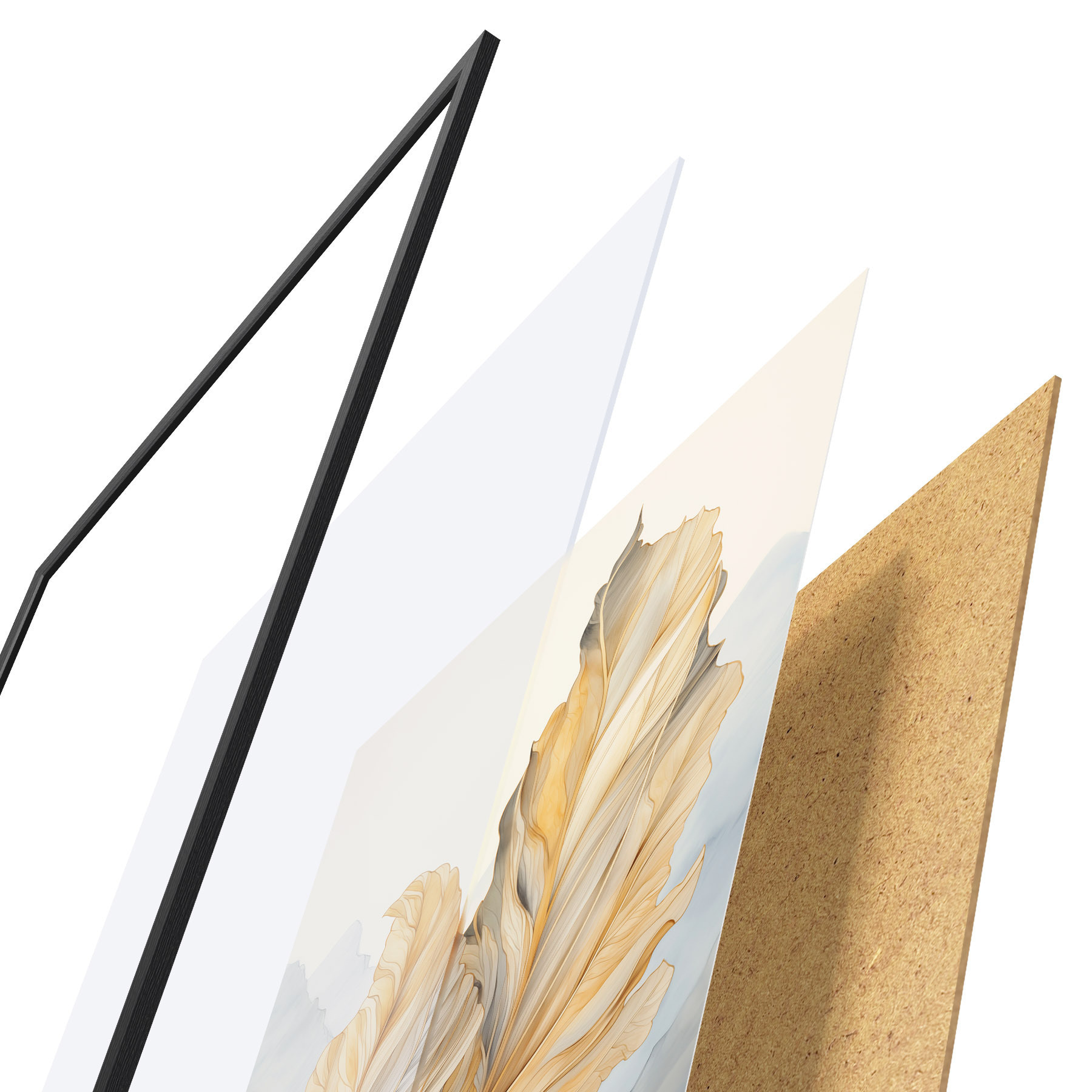 Das Poster besteht aus einem Rahmen, Plexiglas, einem gedruckten Bild und einer Rückwand aus Spanplatten. Dank der Halterungen auf der Rückseite kann das Poster sofort an die Wand gehängt werden.
