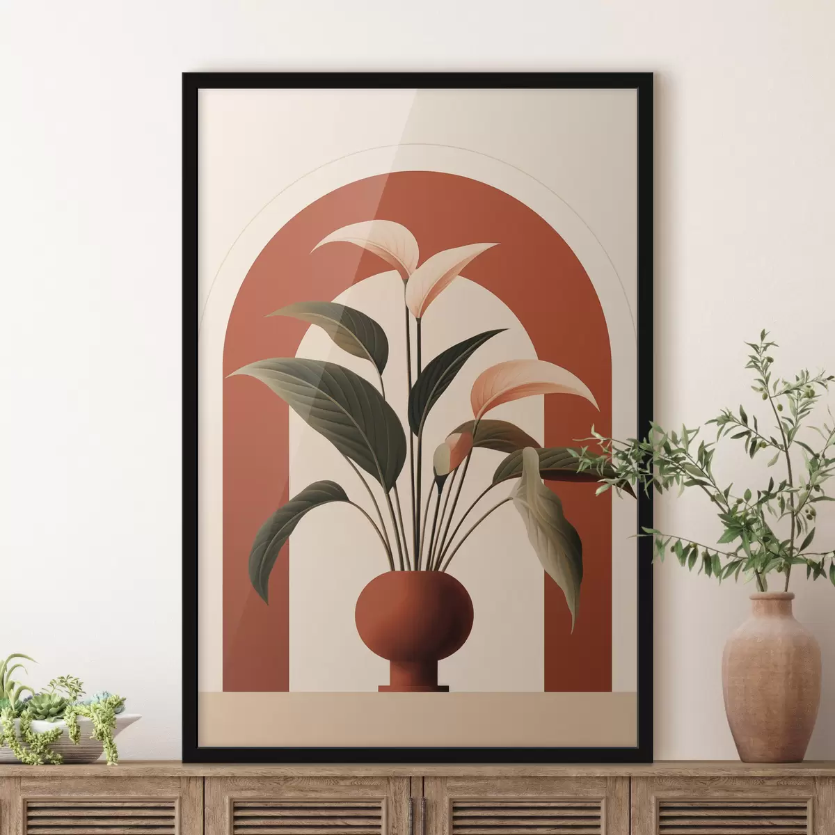 Poster Abstrakte Topfpflanze mit großen grünen und beigen Blättern vor einem cremefarbenen Torbogen mit Terrakotta-Akzenten Nr f47032
