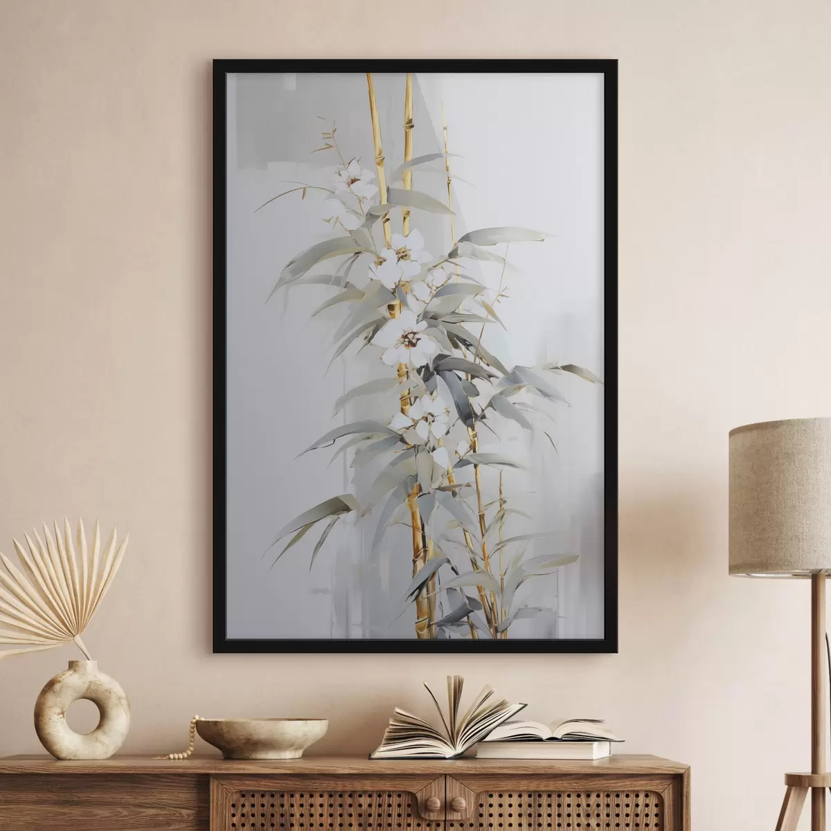 Poster Abstrakte Bambusstämme mit gelben Akzenten, zarten weißen Blüten und hellgrünen Blättern, grauer Hintergrund f47039