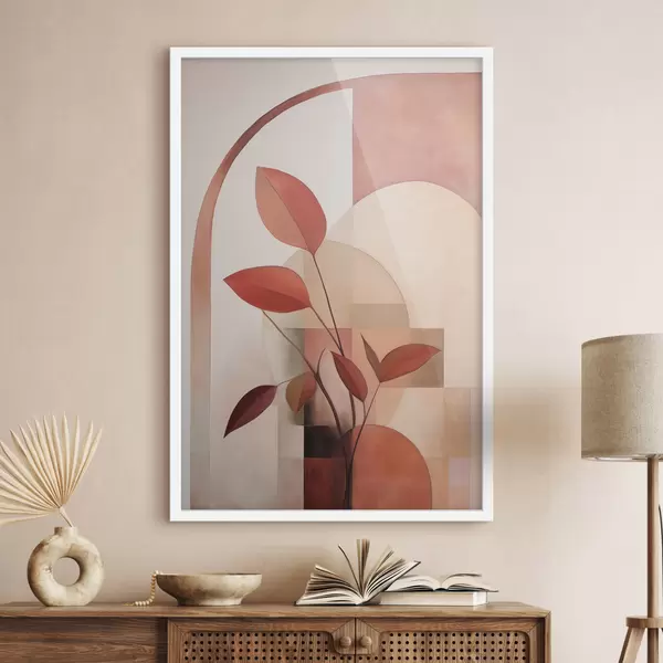 Poster Abstrakte Pflanze mit roten Blättern vor einem Hintergrund aus geometrischen Formen und sanften, gedämpften Farben f47040