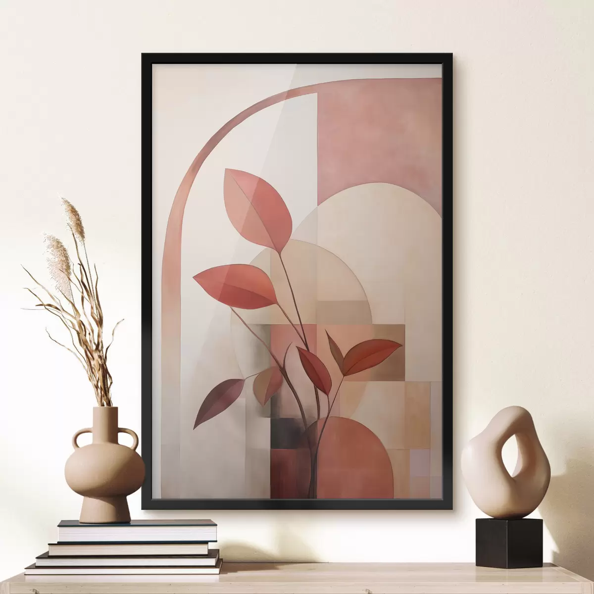 Poster Abstrakte Pflanze mit roten Blättern vor einem Hintergrund aus geometrischen Formen und sanften, gedämpften Farben Nr f47040