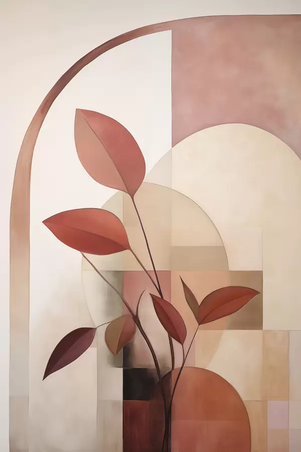 Poster Abstrakte Pflanze mit roten Blättern vor einem Hintergrund aus geometrischen Formen und sanften, gedämpften Farben f47040