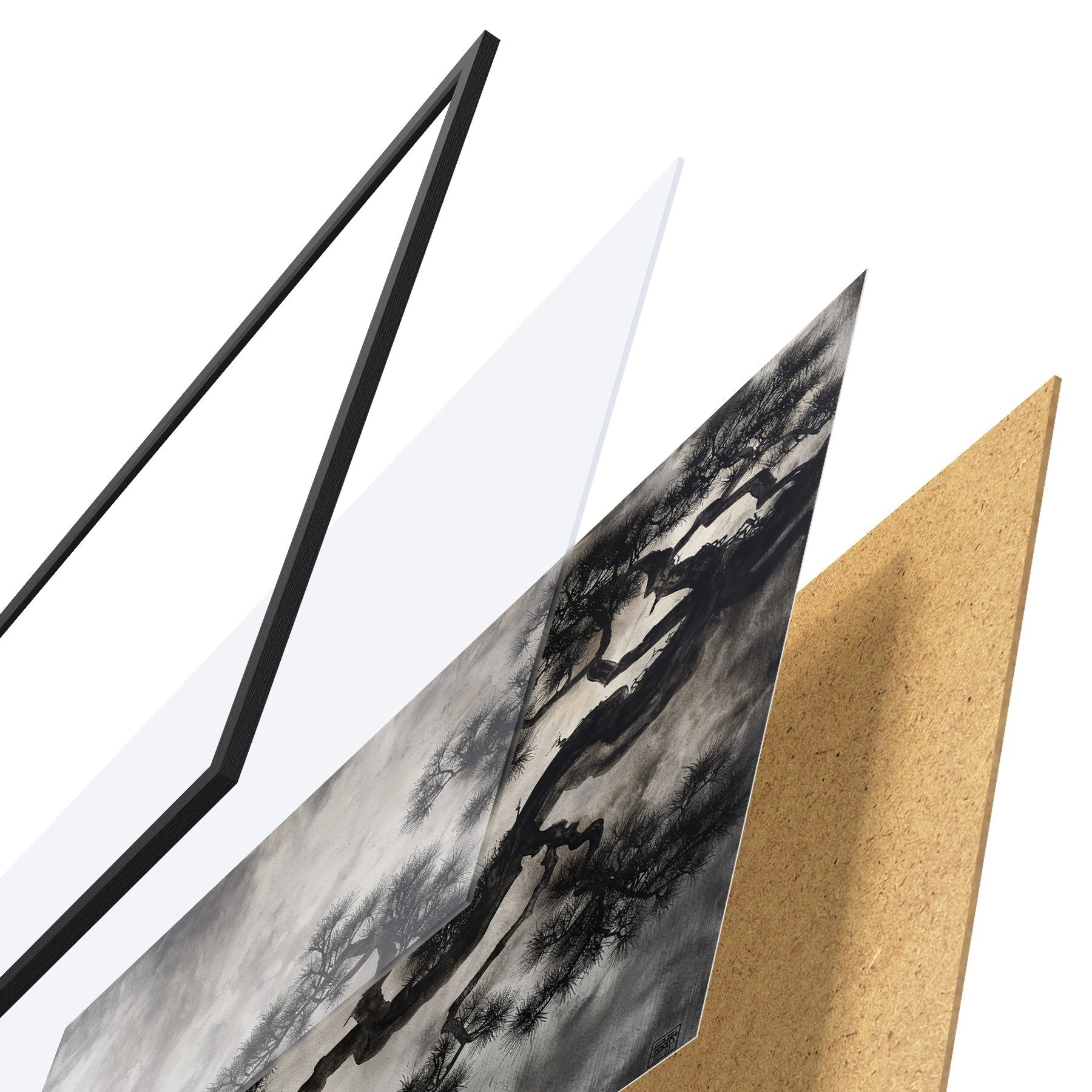 Das Poster besteht aus einem Rahmen, Plexiglas, einem gedruckten Bild und einer Rückwand aus Spanplatten. Dank der Halterungen auf der Rückseite kann das Poster sofort an die Wand gehängt werden.