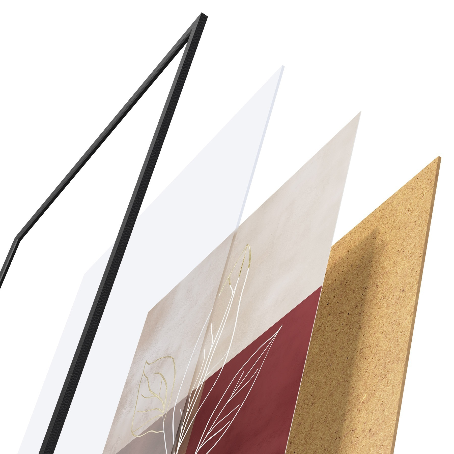 Das Poster besteht aus einem Rahmen, Plexiglas, einem gedruckten Bild und einer Rückwand aus Spanplatten. Dank der Halterungen auf der Rückseite kann das Poster sofort an die Wand gehängt werden.