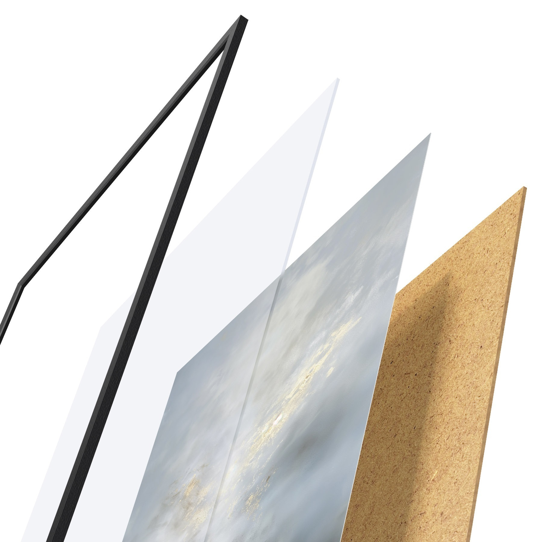 Das Poster besteht aus einem Rahmen, Plexiglas, einem gedruckten Bild und einer Rückwand aus Spanplatten. Dank der Halterungen auf der Rückseite kann das Poster sofort an die Wand gehängt werden.