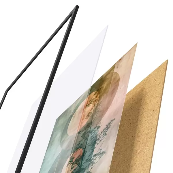 Das Poster besteht aus einem Rahmen, Plexiglas, einem gedruckten Bild und einer Rückwand aus Spanplatten. Dank der Halterungen auf der Rückseite kann das Poster sofort an die Wand gehängt werden.