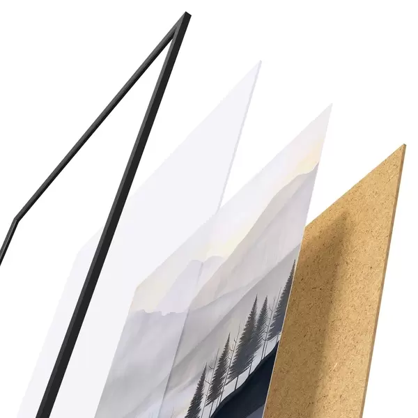 Das Poster besteht aus einem Rahmen, Plexiglas, einem gedruckten Bild und einer Rückwand aus Spanplatten. Dank der Halterungen auf der Rückseite kann das Poster sofort an die Wand gehängt werden.
