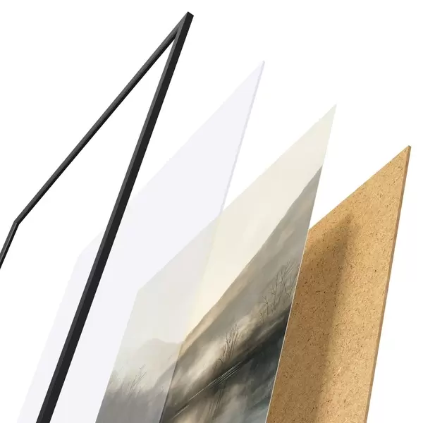 Das Poster besteht aus einem Rahmen, Plexiglas, einem gedruckten Bild und einer Rückwand aus Spanplatten. Dank der Halterungen auf der Rückseite kann das Poster sofort an die Wand gehängt werden.
