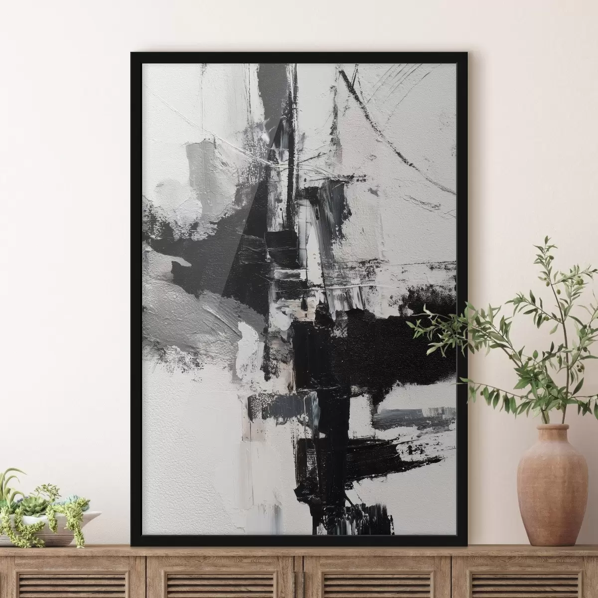 Poster Strukturierte Illustration mit kontrastierenden schwarzen und grauen Pinselstrichen im Stil eines Ölgemäldes f47091