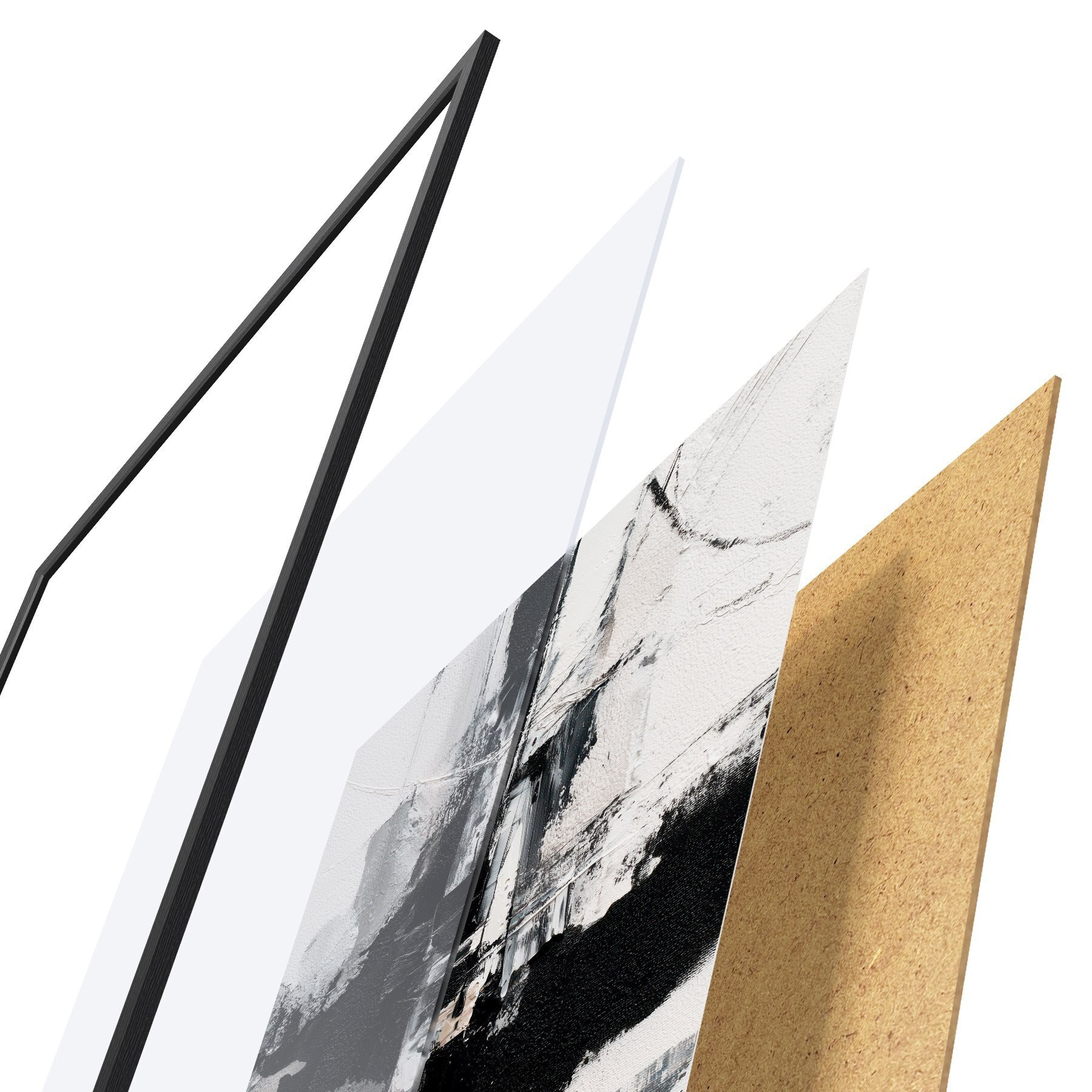 Das Poster besteht aus einem Rahmen, Plexiglas, einem gedruckten Bild und einer Rückwand aus Spanplatten. Dank der Halterungen auf der Rückseite kann das Poster sofort an die Wand gehängt werden.