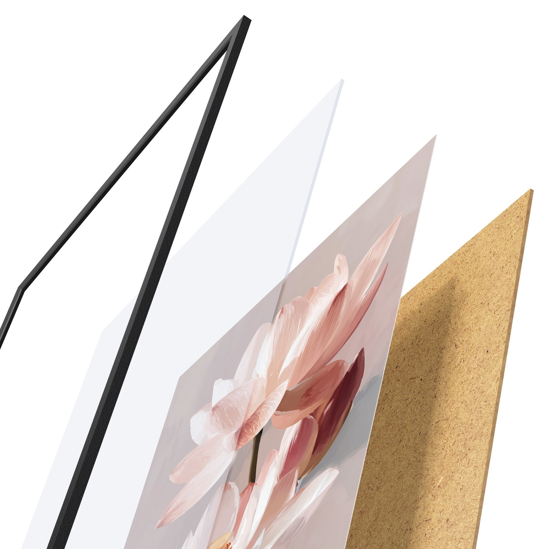 Das Poster besteht aus einem Rahmen, Plexiglas, einem gedruckten Bild und einer Rückwand aus Spanplatten. Dank der Halterungen auf der Rückseite kann das Poster sofort an die Wand gehängt werden.