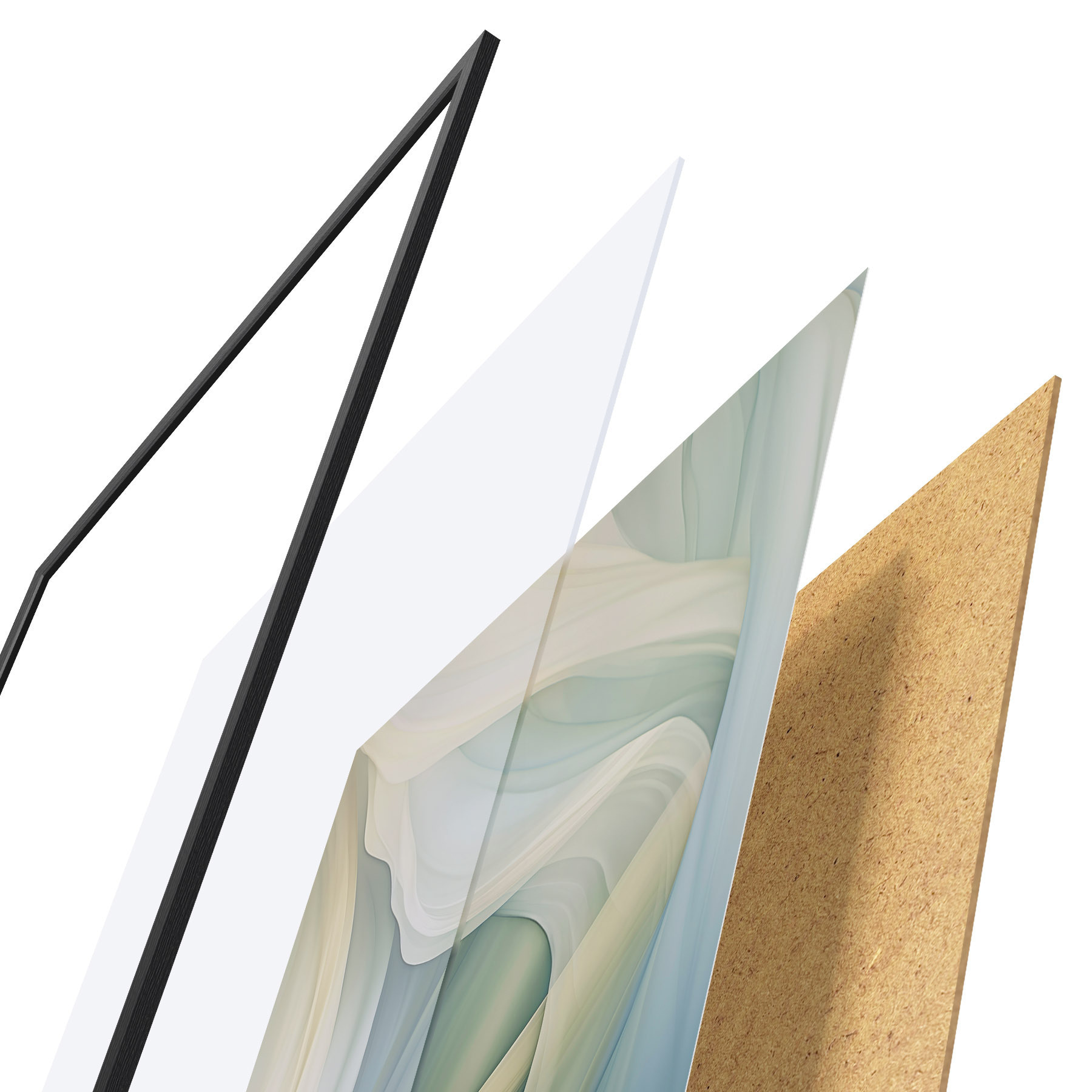 Das Poster besteht aus einem Rahmen, Plexiglas, einem gedruckten Bild und einer Rückwand aus Spanplatten. Dank der Halterungen auf der Rückseite kann das Poster sofort an die Wand gehängt werden.