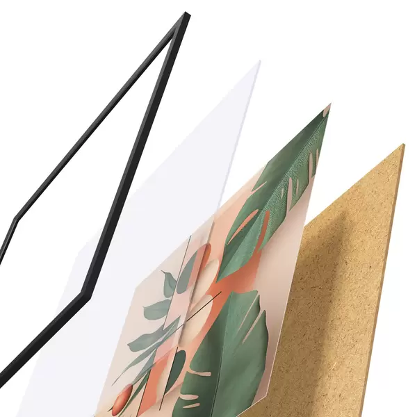 Das Poster besteht aus einem Rahmen, Plexiglas, einem gedruckten Bild und einer Rückwand aus Spanplatten. Dank der Halterungen auf der Rückseite kann das Poster sofort an die Wand gehängt werden.