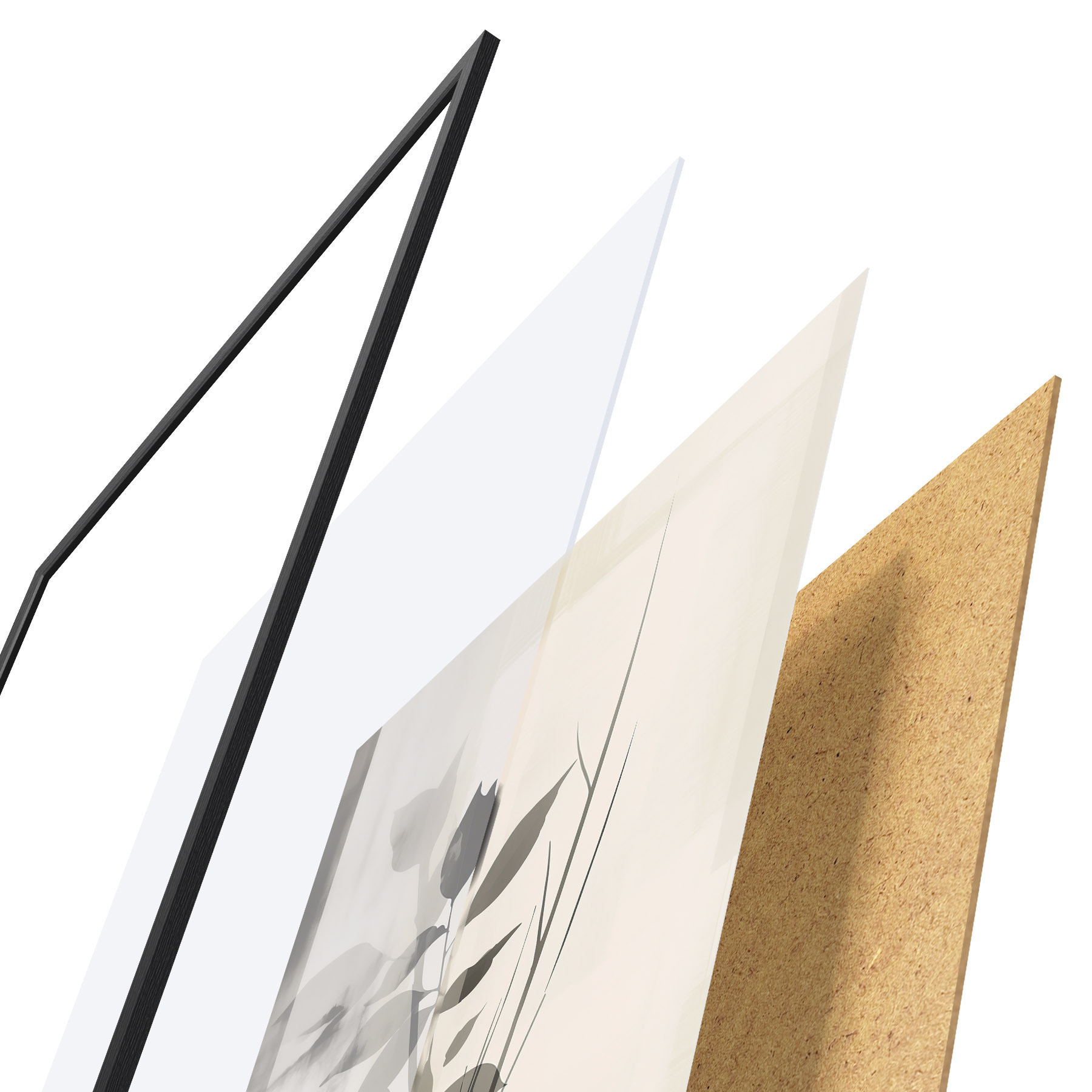 Das Poster besteht aus einem Rahmen, Plexiglas, einem gedruckten Bild und einer Rückwand aus Spanplatten. Dank der Halterungen auf der Rückseite kann das Poster sofort an die Wand gehängt werden.