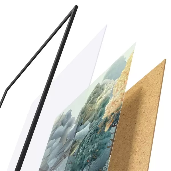 Das Poster besteht aus einem Rahmen, Plexiglas, einem gedruckten Bild und einer Rückwand aus Spanplatten. Dank der Halterungen auf der Rückseite kann das Poster sofort an die Wand gehängt werden.