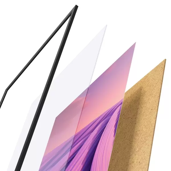 Das Poster besteht aus einem Rahmen, Plexiglas, einem gedruckten Bild und einer Rückwand aus Spanplatten. Dank der Halterungen auf der Rückseite kann das Poster sofort an die Wand gehängt werden.