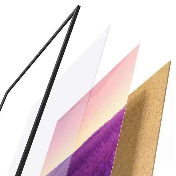 Das Poster besteht aus einem Rahmen, Plexiglas, einem gedruckten Bild und einer Rückwand aus Spanplatten. Dank der Halterungen auf der Rückseite kann das Poster sofort an die Wand gehängt werden.
