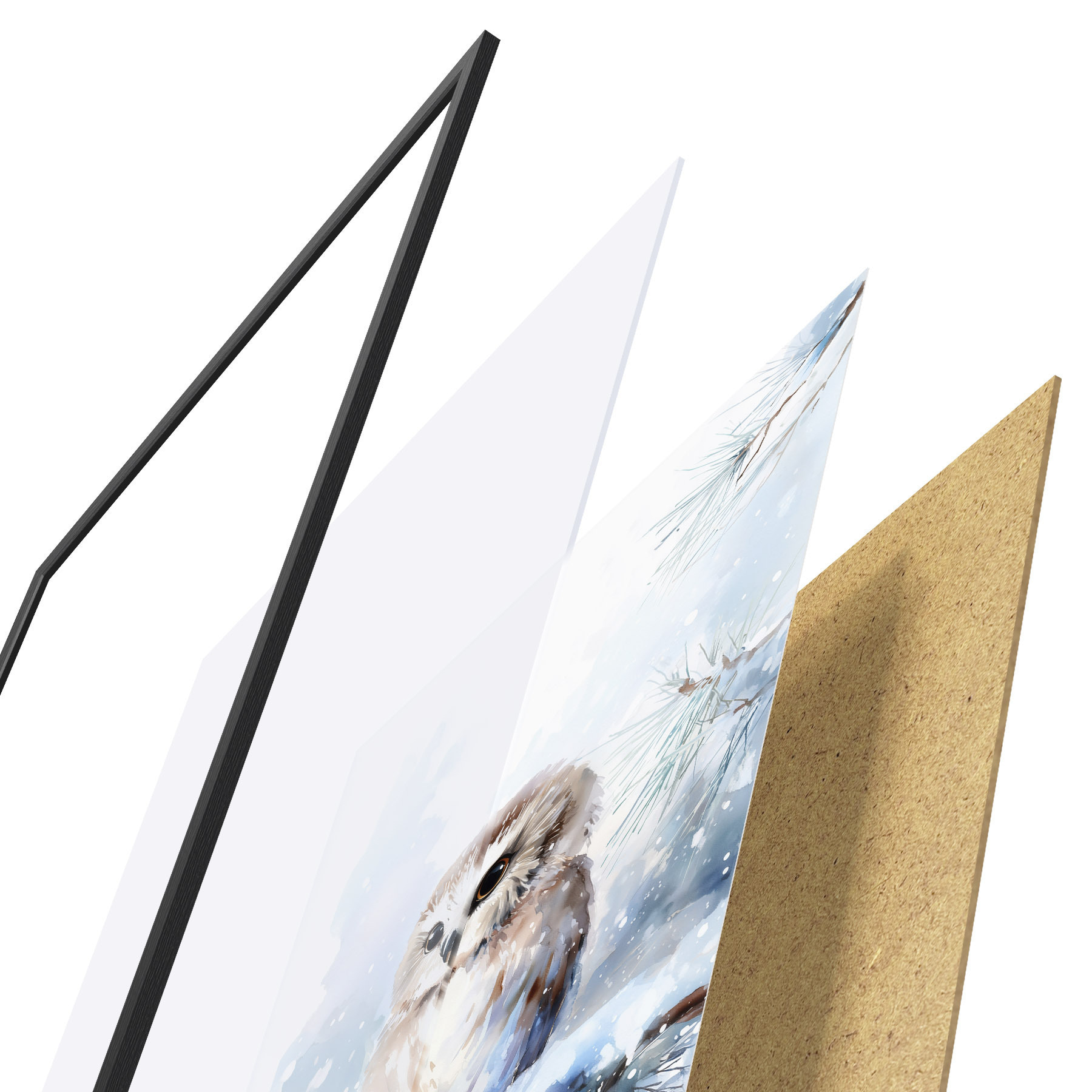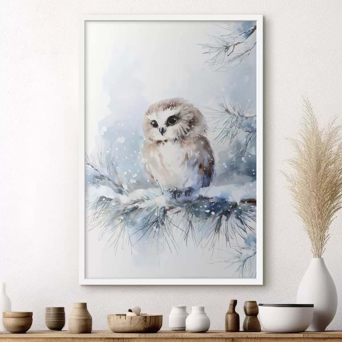 Poster Niedliche Eule auf einem schneebedeckten Tannenzweig im Aquarellstil Nr f47115