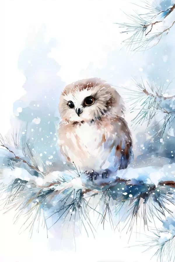 Poster Niedliche Eule auf einem schneebedeckten Tannenzweig im Aquarellstil Nr f47115