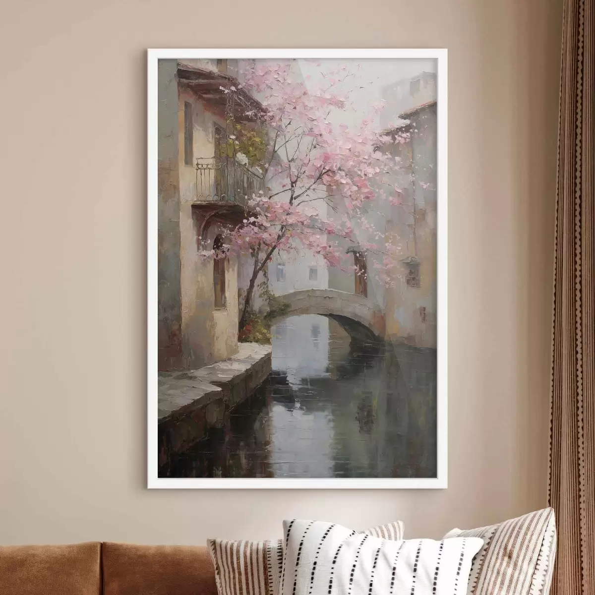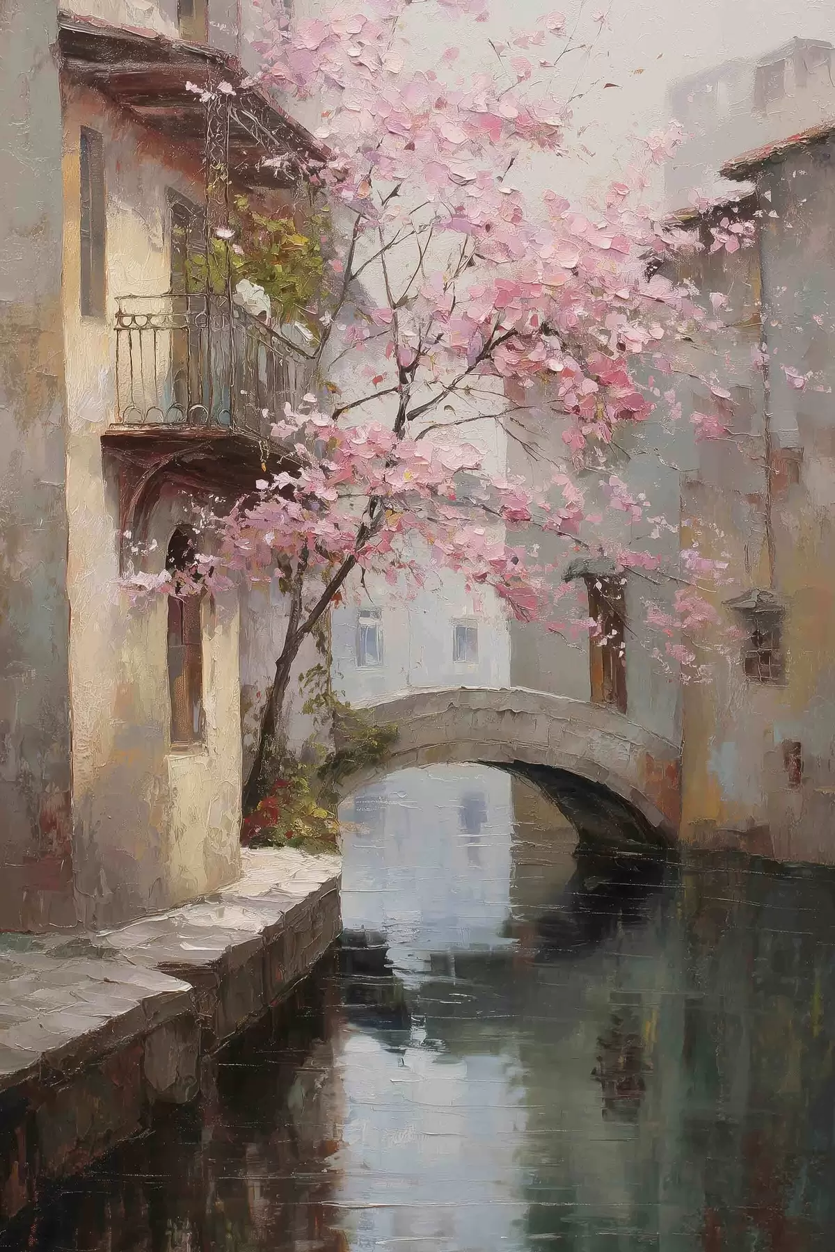 Poster Romantisches Stadtbild mit einem blühenden Baum im Stil eines Ölgemäldes Nr f47126