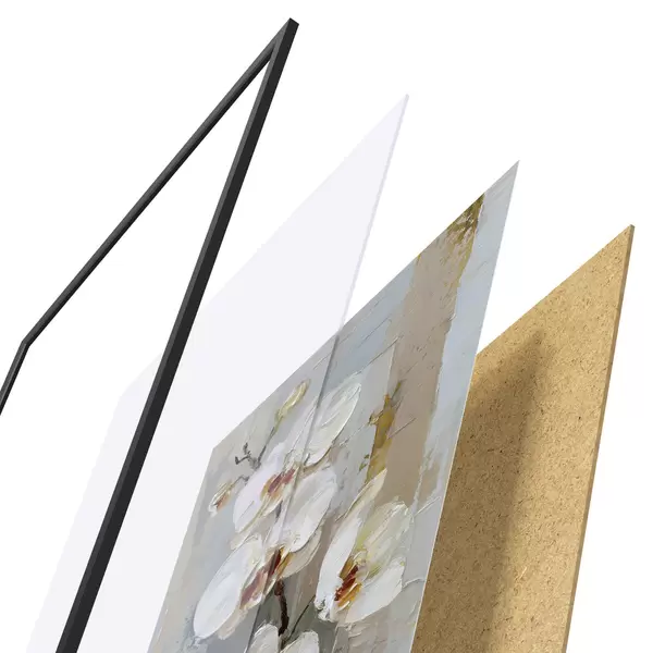 Das Poster besteht aus einem Rahmen, Plexiglas, einem gedruckten Bild und einer Rückwand aus Spanplatten. Dank der Halterungen auf der Rückseite kann das Poster sofort an die Wand gehängt werden.