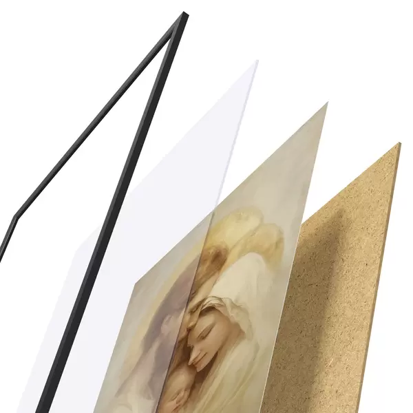 Das Poster besteht aus einem Rahmen, Plexiglas, einem gedruckten Bild und einer Rückwand aus Spanplatten. Dank der Halterungen auf der Rückseite kann das Poster sofort an die Wand gehängt werden.