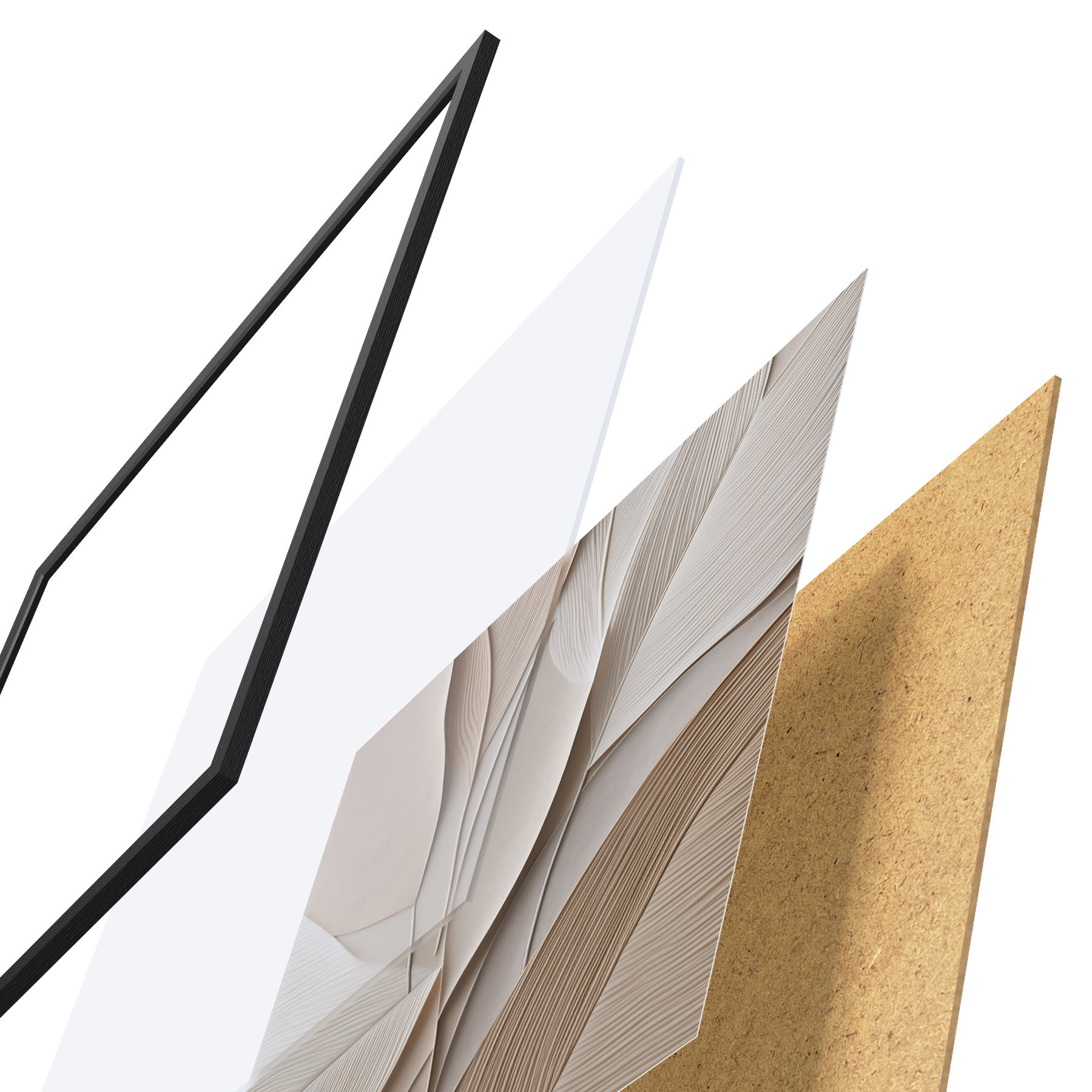 Das Poster besteht aus einem Rahmen, Plexiglas, einem gedruckten Bild und einer Rückwand aus Spanplatten. Dank der Halterungen auf der Rückseite kann das Poster sofort an die Wand gehängt werden.