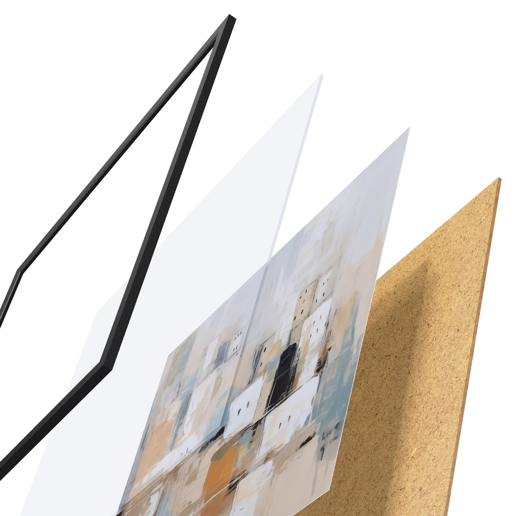 Das Poster besteht aus einem Rahmen, Plexiglas, einem gedruckten Bild und einer Rückwand aus Spanplatten. Dank der Halterungen auf der Rückseite kann das Poster sofort an die Wand gehängt werden.
