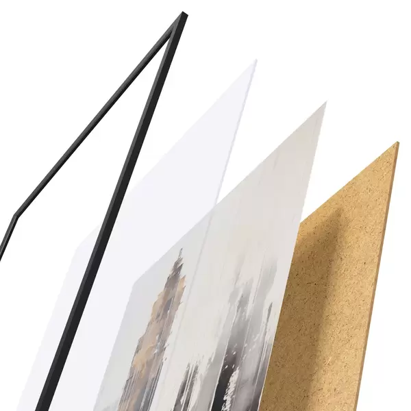Das Poster besteht aus einem Rahmen, Plexiglas, einem gedruckten Bild und einer Rückwand aus Spanplatten. Dank der Halterungen auf der Rückseite kann das Poster sofort an die Wand gehängt werden.