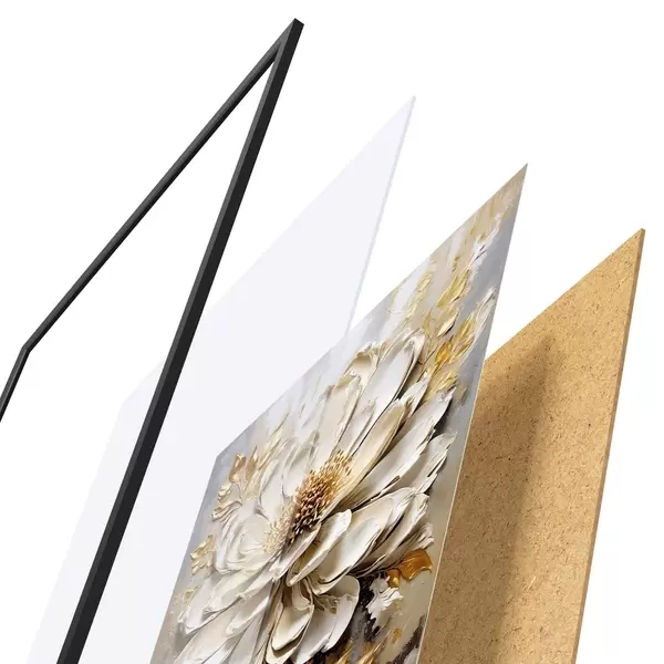 Das Poster besteht aus einem Rahmen, Plexiglas, einem gedruckten Bild und einer Rückwand aus Spanplatten. Dank der Halterungen auf der Rückseite kann das Poster sofort an die Wand gehängt werden.