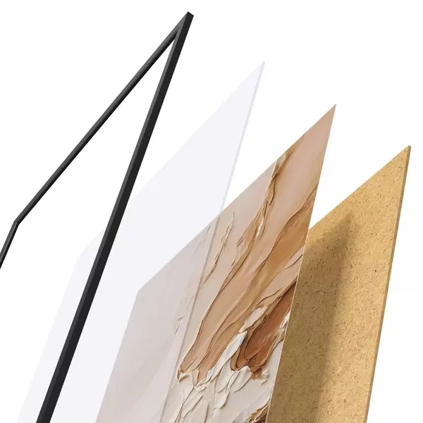 Das Poster besteht aus einem Rahmen, Plexiglas, einem gedruckten Bild und einer Rückwand aus Spanplatten. Dank der Halterungen auf der Rückseite kann das Poster sofort an die Wand gehängt werden.