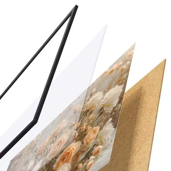 Das Poster besteht aus einem Rahmen, Plexiglas, einem gedruckten Bild und einer Rückwand aus Spanplatten. Dank der Halterungen auf der Rückseite kann das Poster sofort an die Wand gehängt werden.