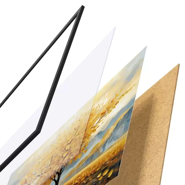 Das Poster besteht aus einem Rahmen, Plexiglas, einem gedruckten Bild und einer Rückwand aus Spanplatten. Dank der Halterungen auf der Rückseite kann das Poster sofort an die Wand gehängt werden.