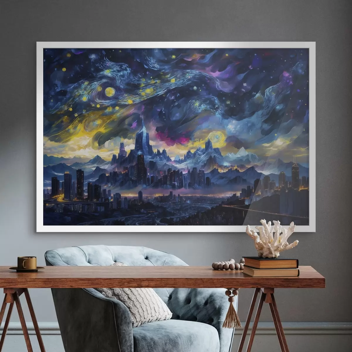 Poster Fantasie-Stadt unter einem leuchtenden Nachthimmel Nr f47288