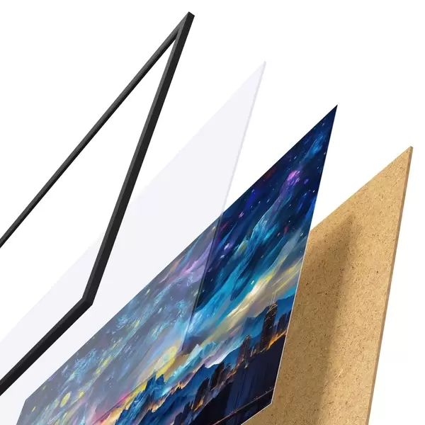 Das Poster besteht aus einem Rahmen, Plexiglas, einem gedruckten Bild und einer Rückwand aus Spanplatten. Dank der Halterungen auf der Rückseite kann das Poster sofort an die Wand gehängt werden.