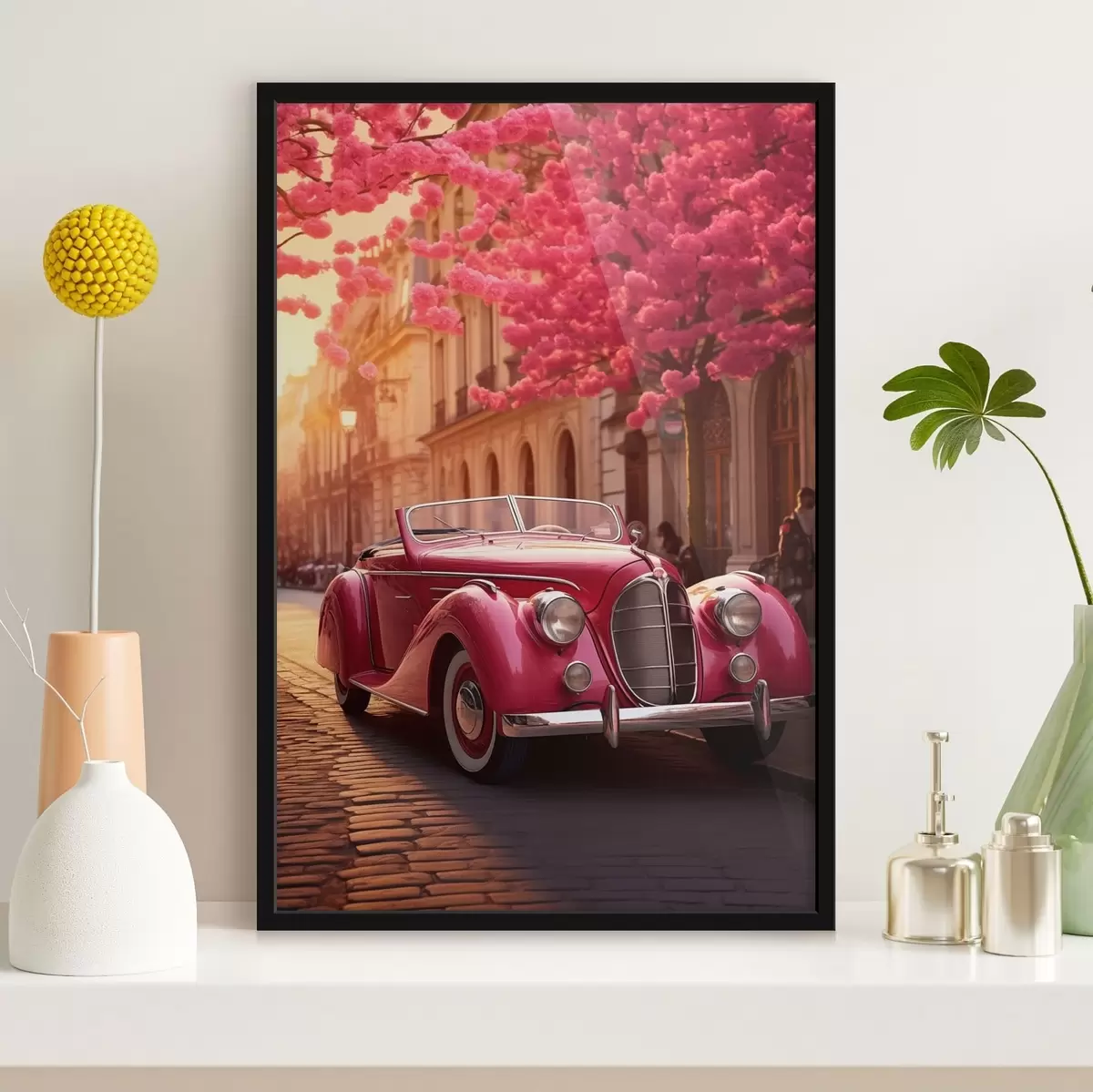 Poster Rosa Auto unter blühenden Bäumen f47295