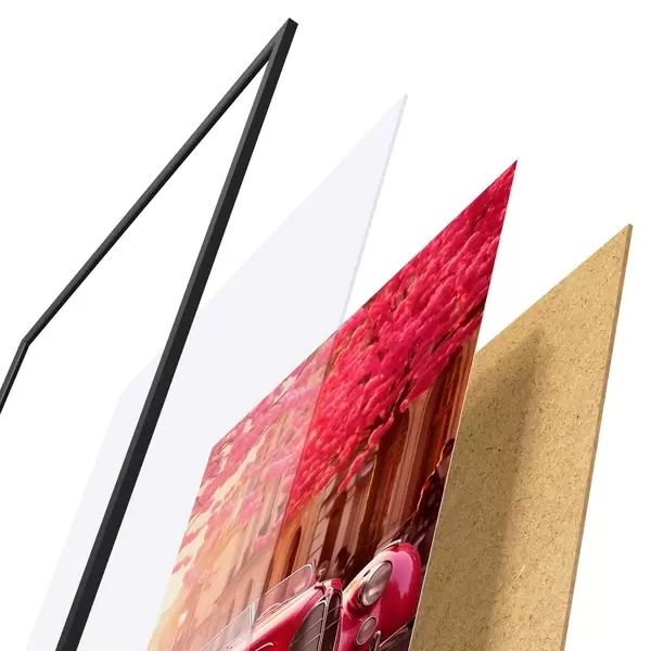 Das Poster besteht aus einem Rahmen, Plexiglas, einem gedruckten Bild und einer Rückwand aus Spanplatten. Dank der Halterungen auf der Rückseite kann das Poster sofort an die Wand gehängt werden.