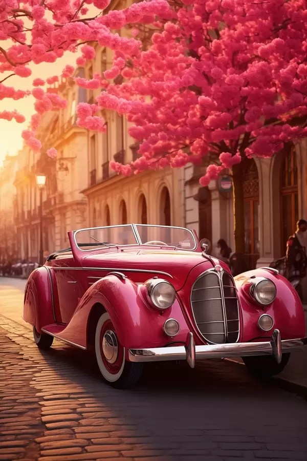 Poster Rosa Auto unter blühenden Bäumen f47295