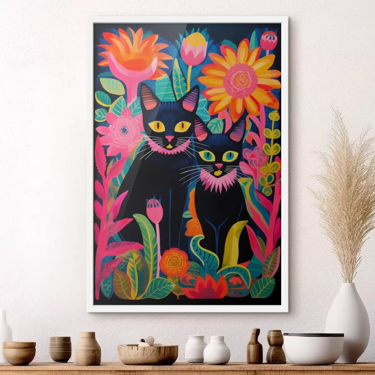 Poster Zwei schwarze Katzen zwischen bunten Blumen f47299