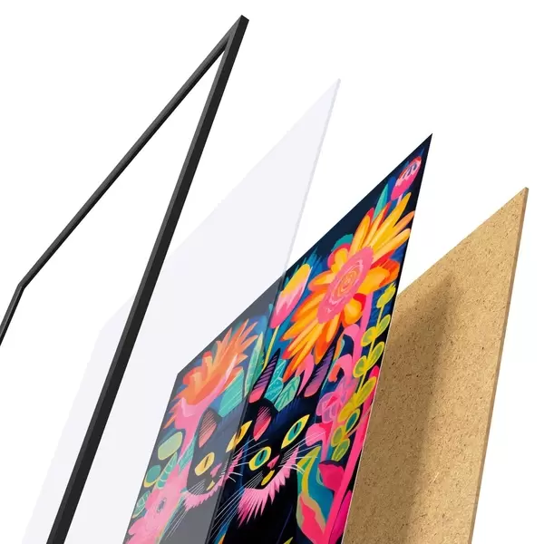 Das Poster besteht aus einem Rahmen, Plexiglas, einem gedruckten Bild und einer Rückwand aus Spanplatten. Dank der Halterungen auf der Rückseite kann das Poster sofort an die Wand gehängt werden.